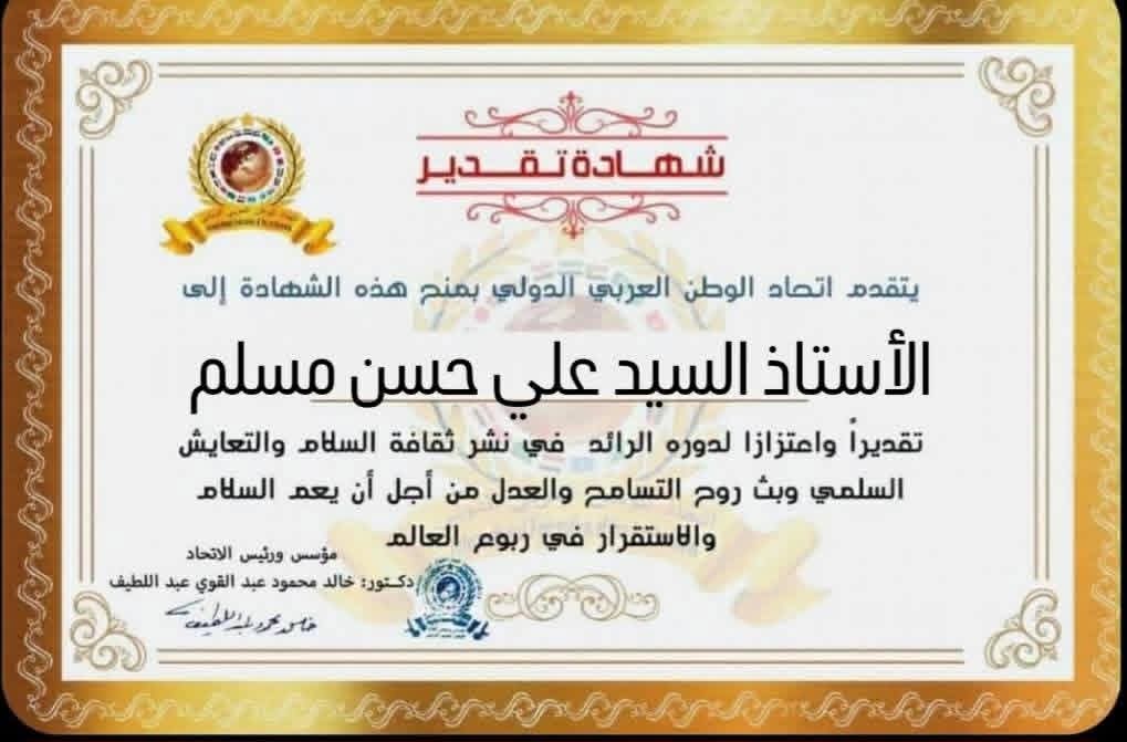 مؤسس ورئيس اتحاد الوطن العربي الدولي يمنح شهادة تقدير للأستاذ السيد علي حسن مسلم مدير مديرية التضامن الأجتماعي بمحافظة بور سعيد بوزارة التضامن الأجتماعي بجمهورية مصر العربية