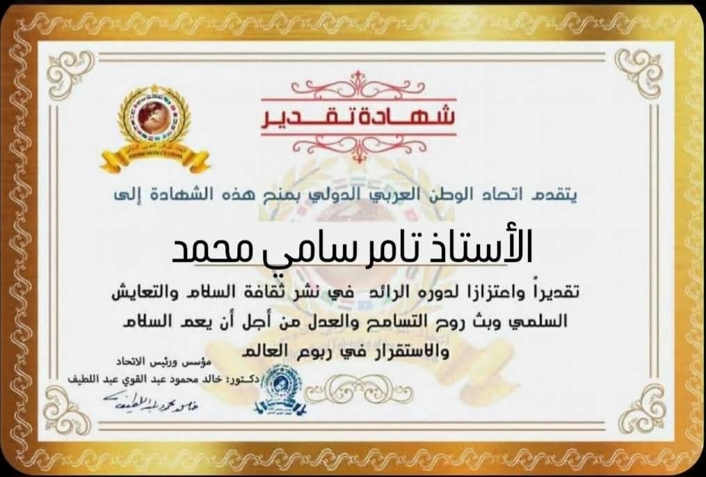 مؤسس ورئيس اتحاد الوطن العربي الدولي يمنح شهادة تقدير للأستاذ تامر سامي محمد مدير عام الإدارة العامة لخدمة المواطنين بوزارة التضامن الأجتماعي بجمهورية مصر العربيةitihadworld31/03/2026تكريمات