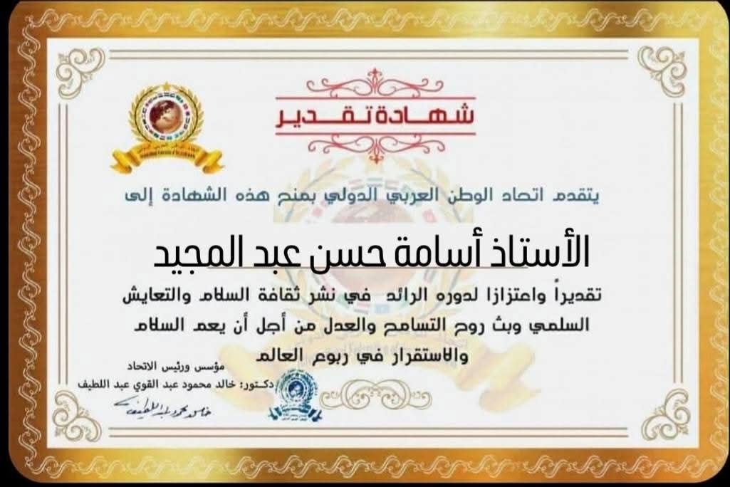 مؤسس ورئيس اتحاد الوطن العربي الدولي يمنح شهادة تقدير للأستاذ أسامة حسن عبد المجيد مدير عام الإدارة للدعم النقدي بوزارة التضامن الأجتماعي بجمهورية مصر العربيةitihadworld31/03/2026تكريمات