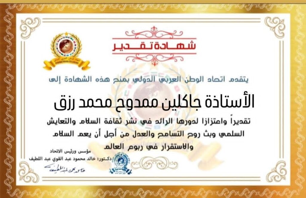 مؤسس ورئيس اتحاد الوطن العربي الدولي يمنح شهادة تقدير للأستاذة جاكلين ممدوح محمد رزق رئيس الإدارة المركزية للرعاية الإجتماعية بديوان عام وزارة التضامن الأجتماعي بجمهورية مصر العربيةitihadworld31/03/2026تكريمات