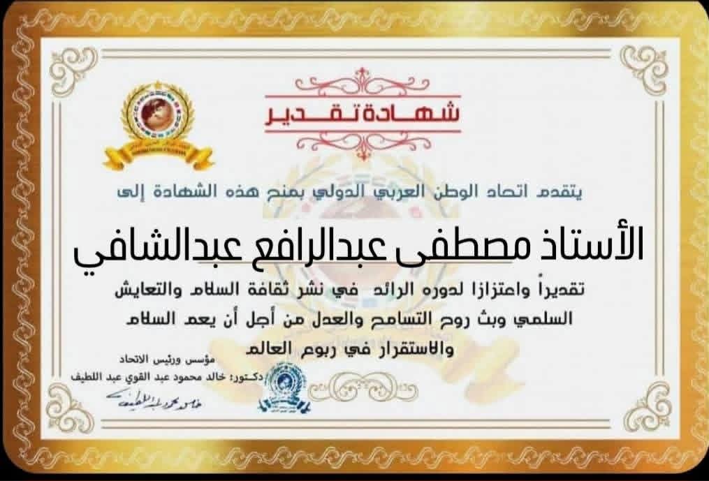 مؤسس ورئيس اتحاد الوطن العربي الدولي يمنح شهادة تقدير للأستاذ مصطفى عبد الرافع صالح عبد الشافي مدير عام الإدارة العامة للشؤون القانونية بوزارة التضامن الأجتماعي بجمهورية مصر العربيةitihadworld31/03/2026تكريمات
