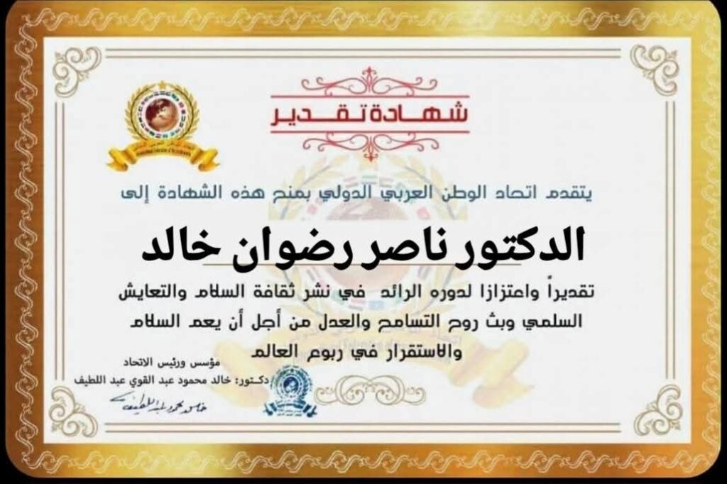 مؤسس ورئيس اتحاد الوطن العربي الدولي يمنح شهادة تقدير للدكتور ناصر رضوان خالد أستاذ هندسة الأساسات بالمركز القومي لبحوث الإسكان والبناءitihadworld27/12/2025تكريمات