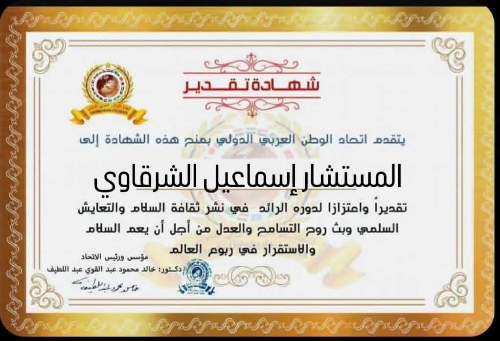 مؤسس ورئيس اتحاد الوطن العربي الدولي يمنح شهادة تقدير للمستشار إسماعيل الشرقاوي عضو مجلس الشعب الأسبق وعضو الإتحاد من جمهورية مصر العربية
