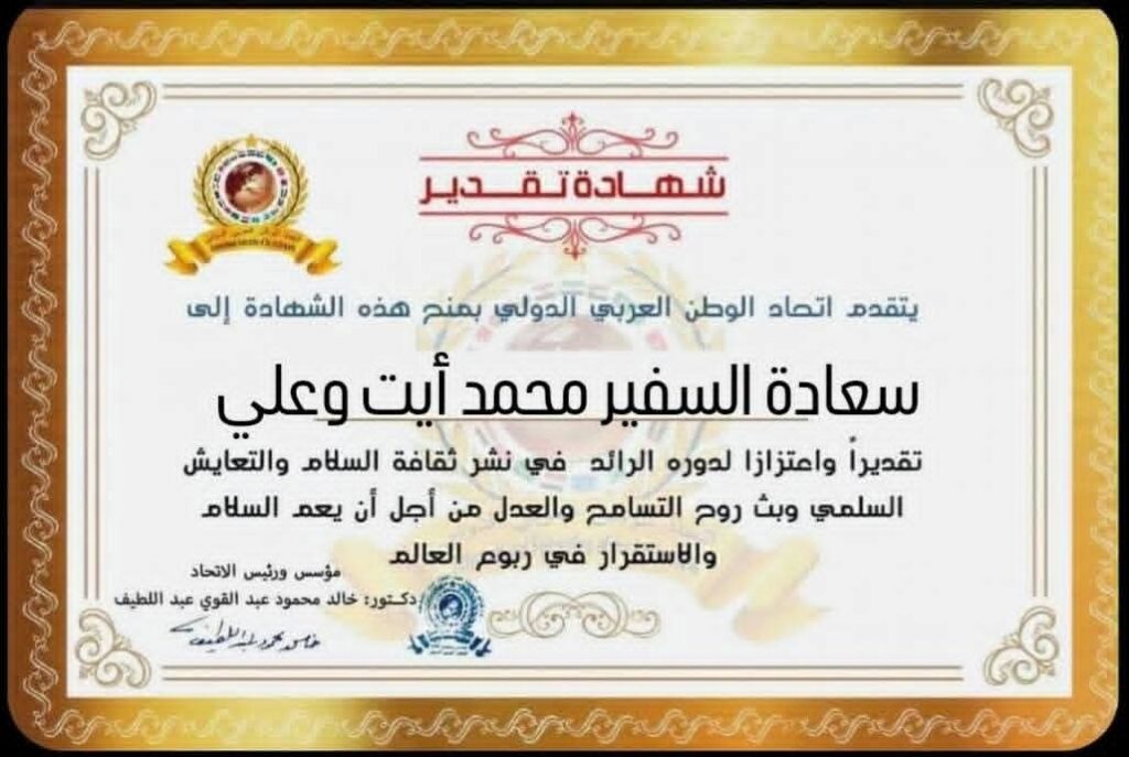 مؤسس ورئيس اتحاد الوطن العربي الدولي يمنح شهادة تقدير لسعادة السفير محمد أيت وعلي سفير المملكة المغربية لدى جمهورية مصر العربية ومندوبها الدائم لدى جامعة الدول العربيةitihadworld31/03/2026تكريمات