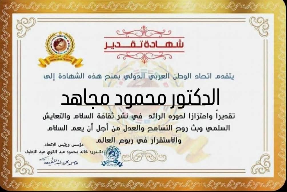 مؤسس ورئيس اتحاد الوطن العربي الدولي يمنح شهادة تقدير للدكتور محمود مجاهد مدير المكتب الفني لرئيس هيئة التأمين الصحي بجمهورية مصر العربيةitihadworld06/04/2026تكريمات
