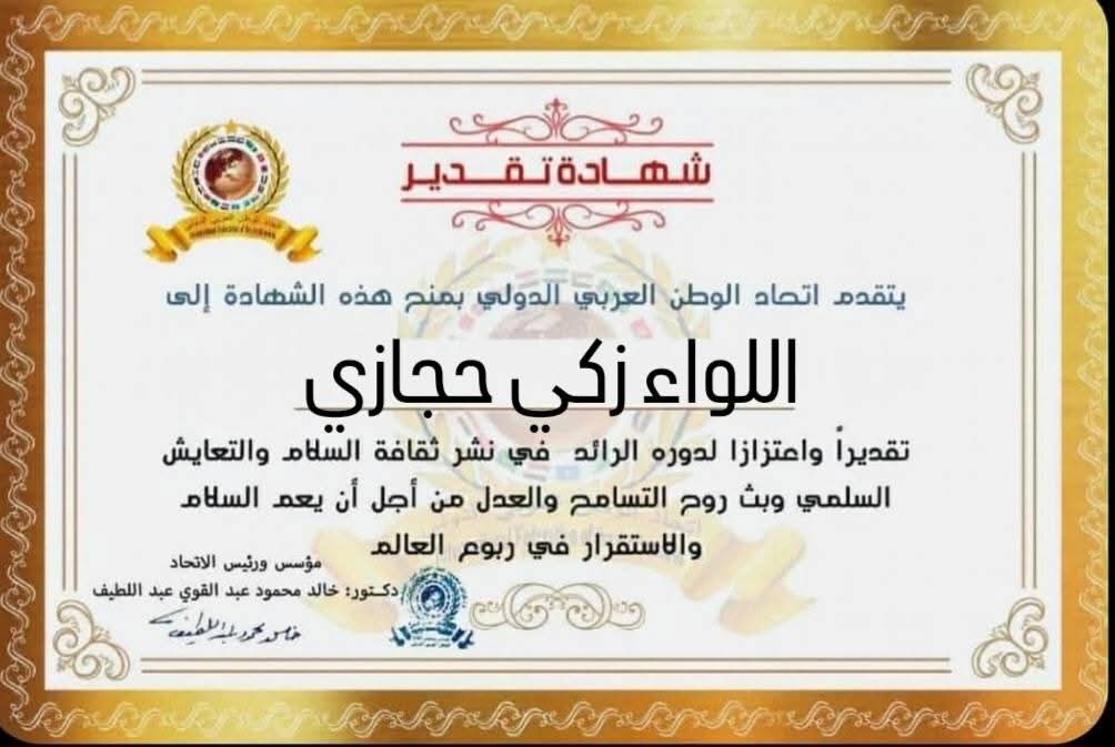 مؤسس ورئيس اتحاد الوطن العربي الدولي يمنح شهادة تقدير للواء زكي حجازي نائب مدير عام نادي سموحة بالإسكندرية بجمهورية مصر العربيةitihadworld06/04/2026تكريمات