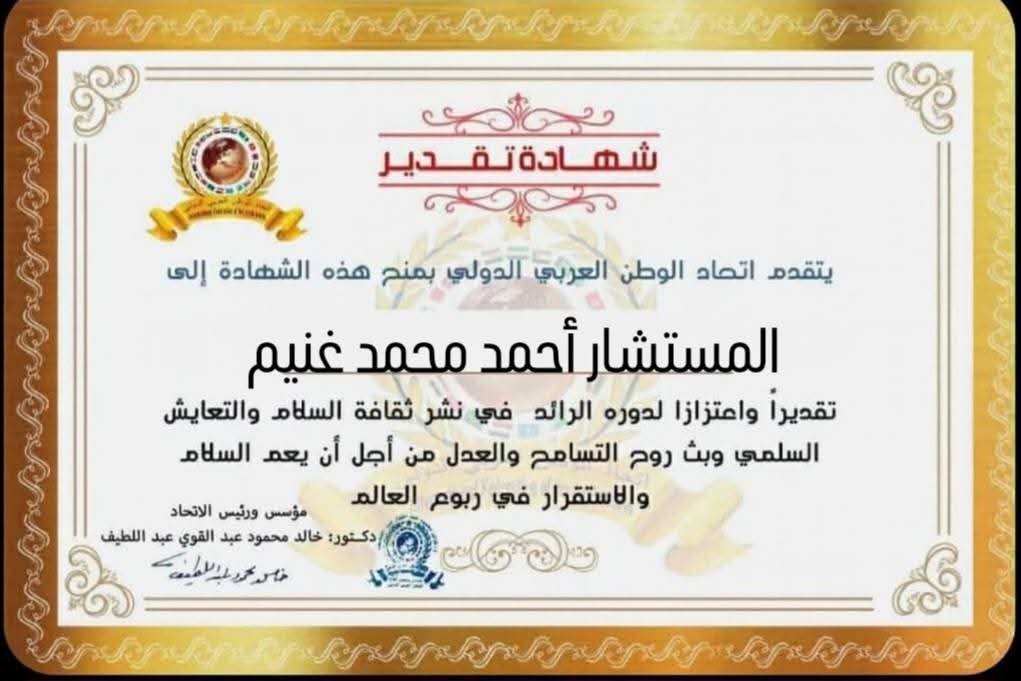 مؤسس ورئيس اتحاد الوطن العربي الدولي يمنح شهادة تقدير للمستشار أحمد محمد طلبه محمد غنيم رئيس محكمة استئناف القاهرة ومساعد وزير العدل لشؤون قطاع المحاكم والمطالبات القضائية بجمهورية مصر العربيةitihadworld07/04/2026تكريمات