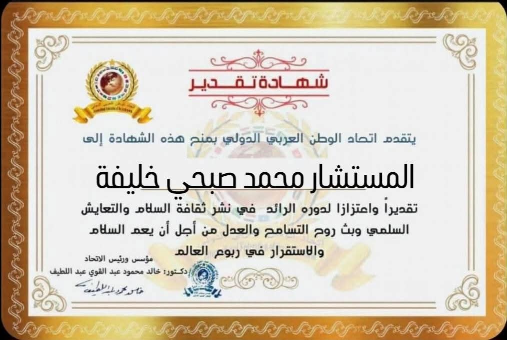 مؤسس ورئيس اتحاد الوطن العربي الدولي يمنح شهادة تقدير للمستشار محمد صبحي عبد الحكيم خليفة رئيس محكمة استئناف القاهرة ومساعد وزير العدل لشؤون قطاعي الخبراء والطب الشرعي بجمهورية مصر العربيةitihadworld07/04/2026تكريمات
