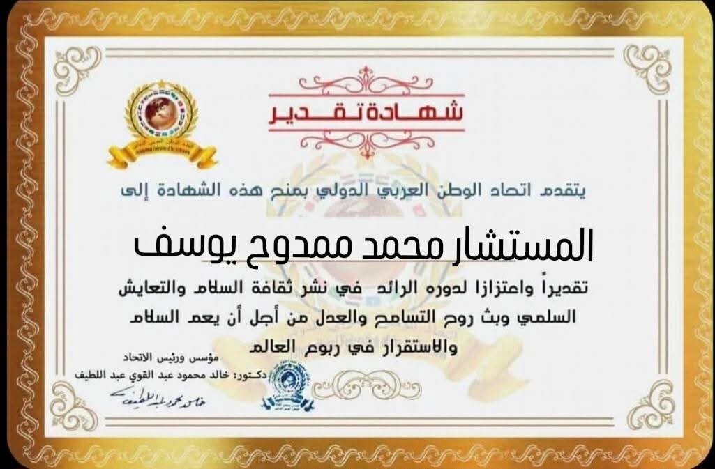 مؤسس ورئيس اتحاد الوطن العربي الدولي يمنح شهادة تقدير للمستشار محمد ممدوح محمد أحمد يوسف نائب رئيس محكمة النقض ومساعد وزير العدل لشؤون قطاع التعاون الدولي بجمهورية مصر العربية