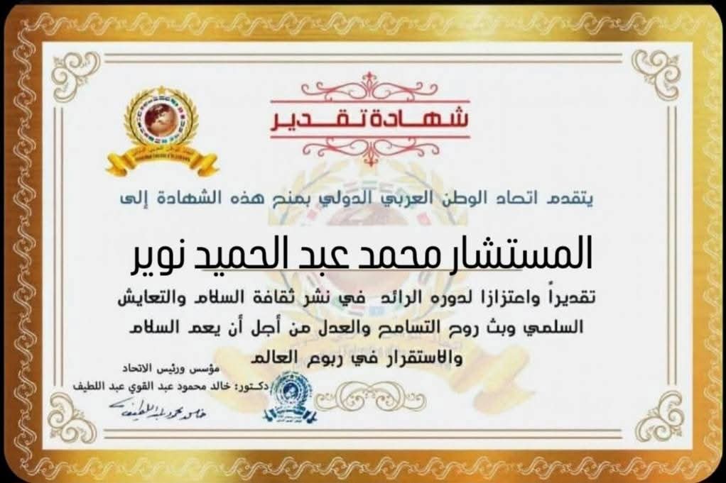 مؤسس ورئيس اتحاد الوطن العربي الدولي يمنح شهادة تقدير للمستشار محمد عبد الحميد نوير نائب رئيس مجلس الدولة بجمهورية مصر العربيةitihadworld07/04/2026تكريمات