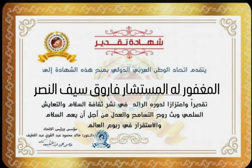 مؤسس ورئيس اتحاد الوطن العربي الدولي يمنح شهادة تقدير للمغفور له بإذن الله المستشار فاروق سيف النصر وزير العدل الأسبق وعضو الإتحاد من جمهورية مصر العربيةitihadworld07/04/2026تكريمات