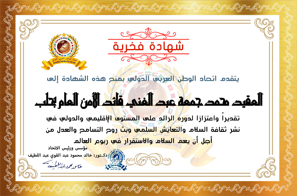 مؤسس ورئيس اتحاد الوطن العربي الدولي يمنح شهادة تقدير للعقيد محمد جمعة عبد الغني قائد الأمن العام بحلب في الجمهورية العربية السوريةitihadworld08/04/2026تكريمات