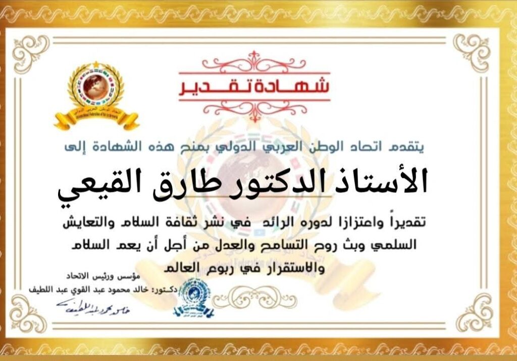 مؤسس ورئيس اتحاد الوطن العربي الدولي يمنح شهادة تقدير للأستاذ الدكتور طارق القيعي عميد كلية الزراعة جامعة الإسكندرية الأسبق ورئيس المجلس الشعبي المحلي لمحافظة الإسكندرية الأسبق وعضو الإتحادitihadworld29/12/2025تكريمات