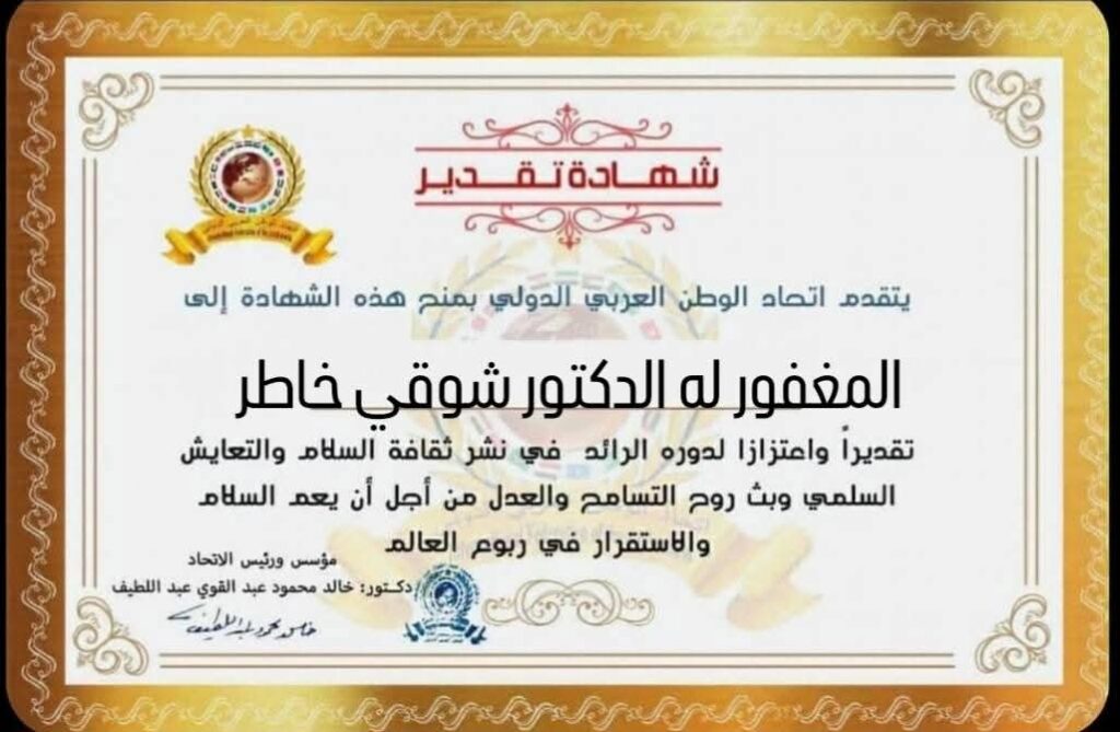 مؤسس ورئيس اتحاد الوطن العربي الدولي يمنح شهادة تقدير للمغفور له بإذن الله تعالى الدكتور شوقي خاطر رئيس جامعة طنطا و رئيس الجهاز المركزي للمحاسبات الأسبق من جمهورية مصر العربية