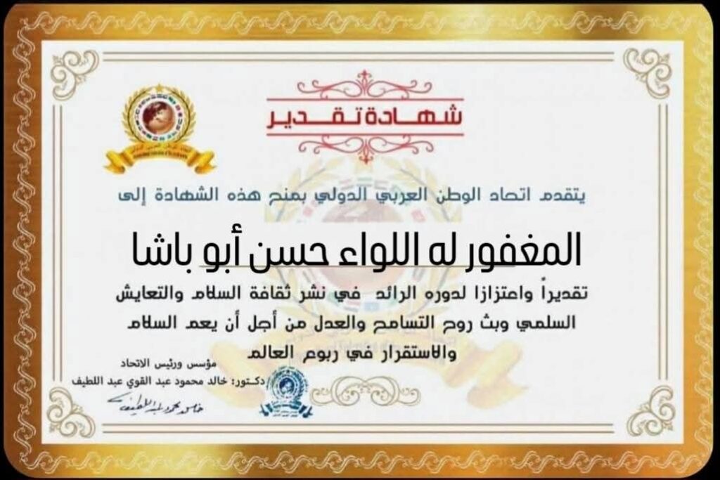 مؤسس ورئيس اتحاد الوطن العربي الدولي يمنح شهادة تقدير للمغفور له بإذن الله اللواء حسن أبو باشا وزير الداخلية والحكم المحلي الأسبق من جمهورية مصر العربية