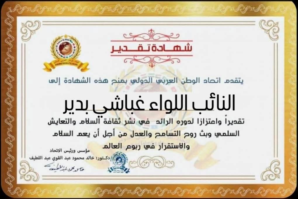 مؤسس ورئيس اتحاد الوطن العربي الدولي يمنح شهادة تقدير للنائب اللواء غباشي بدير من محافظة الغربية بجمهورية مصر العربيةitihadworld10/04/2026تكريمات