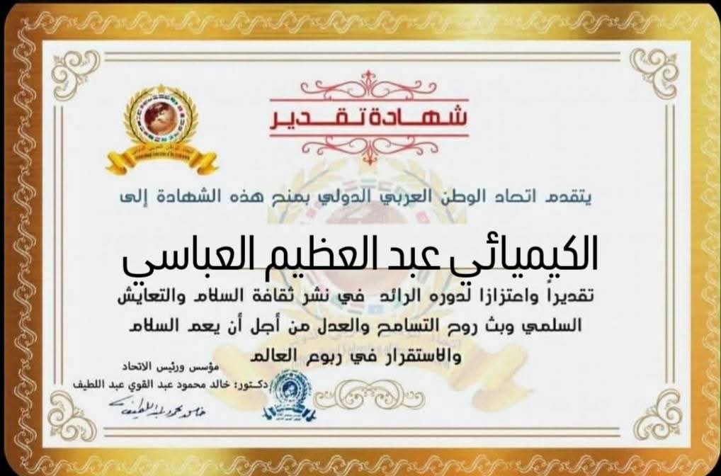 مؤسس ورئيس اتحاد الوطن العربي الدولي يمنح شهادة تقدير للكيميائي عبد العظيم العباسي رئيس مجلس إدارة نادي المالية بكفر الزيات والعضو المنتدب من جمهورية مصر العربيةitihadworld10/04/2026تكريمات