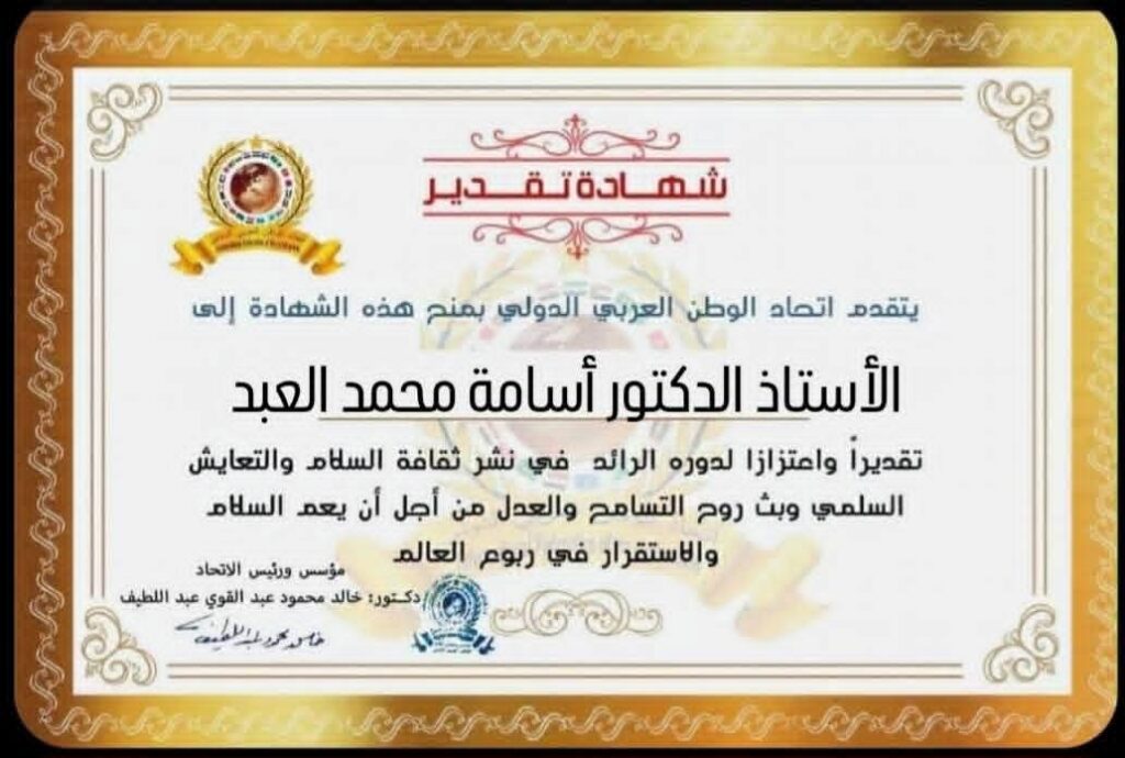 مؤسس ورئيس اتحاد الوطن العربي الدولي يمنح شهادة تقدير للأستاذ الدكتور أسامة محمد العبد رئيس لجنة الشؤون الدينية والأوقاف بمجلس النواب السابق من جمهورية مصر العربية