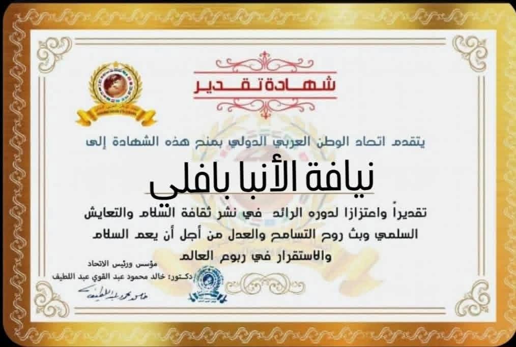 مؤسس ورئيس اتحاد الوطن العربي الدولي يمنح شهادة تقدير لنيافة الأنبا بافلي أسقف عام قطاع المنتزه بالإسكندرية بجمهورية مصر العربية حيث