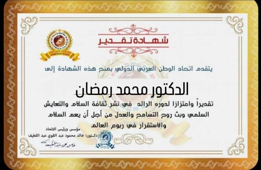 مؤسس ورئيس اتحاد الوطن العربي الدولي يمنح شهادة تقدير للدكتور محمد رمضان رئيس الجالية السورية لدى تركيا