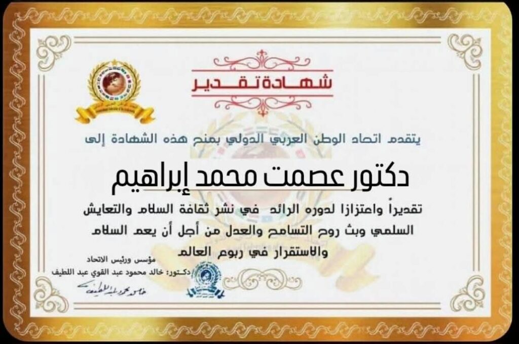 مؤسس ورئيس اتحاد الوطن العربي الدولي يمنح شهادة تقدير للدكتور عصمت محمد إبراهيم مدير مستشفى أطفال الانفوشي بالإسكندرية بجمهورية مصر العربيةitihadworld13/04/2026تكريمات