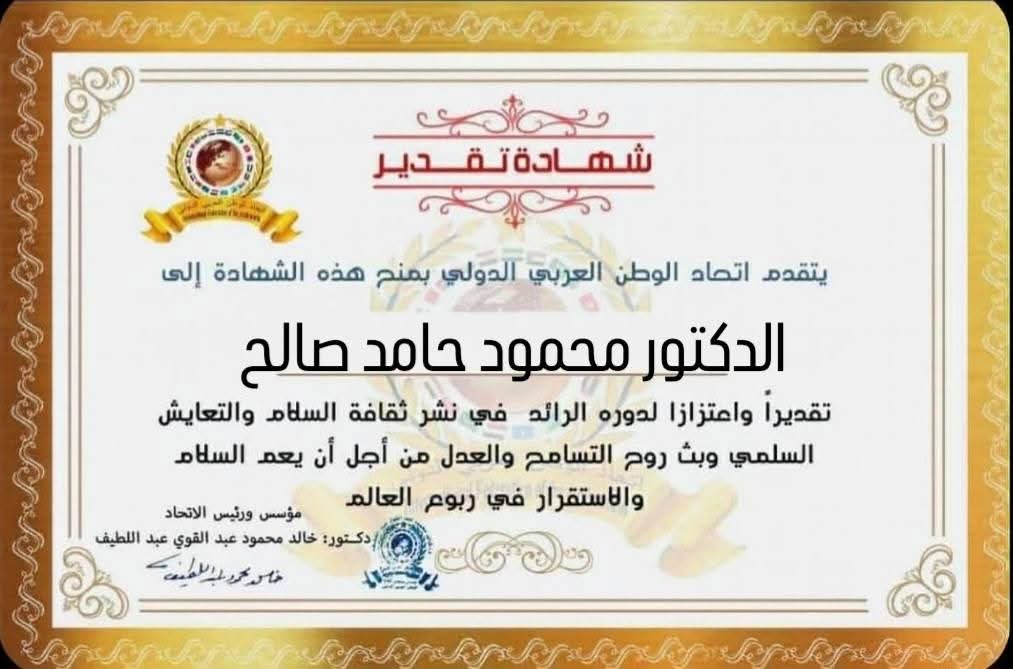 مؤسس ورئيس اتحاد الوطن العربي الدولي يمنح شهادة تقدير للدكتور محمود حامد صالح رئيس قطاع الفنون التشكيلية بوزارة الثقافة بجمهورية مصر العربيةitihadworld13/04/2026تكريمات