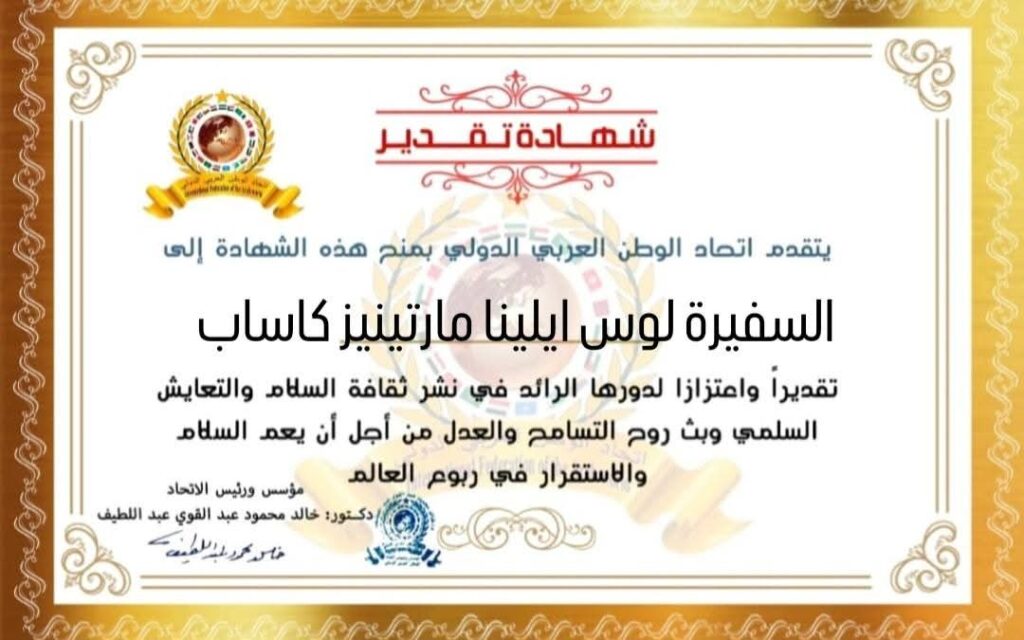 مؤسس ورئيس اتحاد الوطن العربي الدولي يمنح شهادة تقدير للدكتور للسفيرة لوس ايلينا مارتينيز كاساب سفيرة جمهورية كولومبيا لدى جمهورية مصر العربيةitihadworld14/04/2026تكريمات