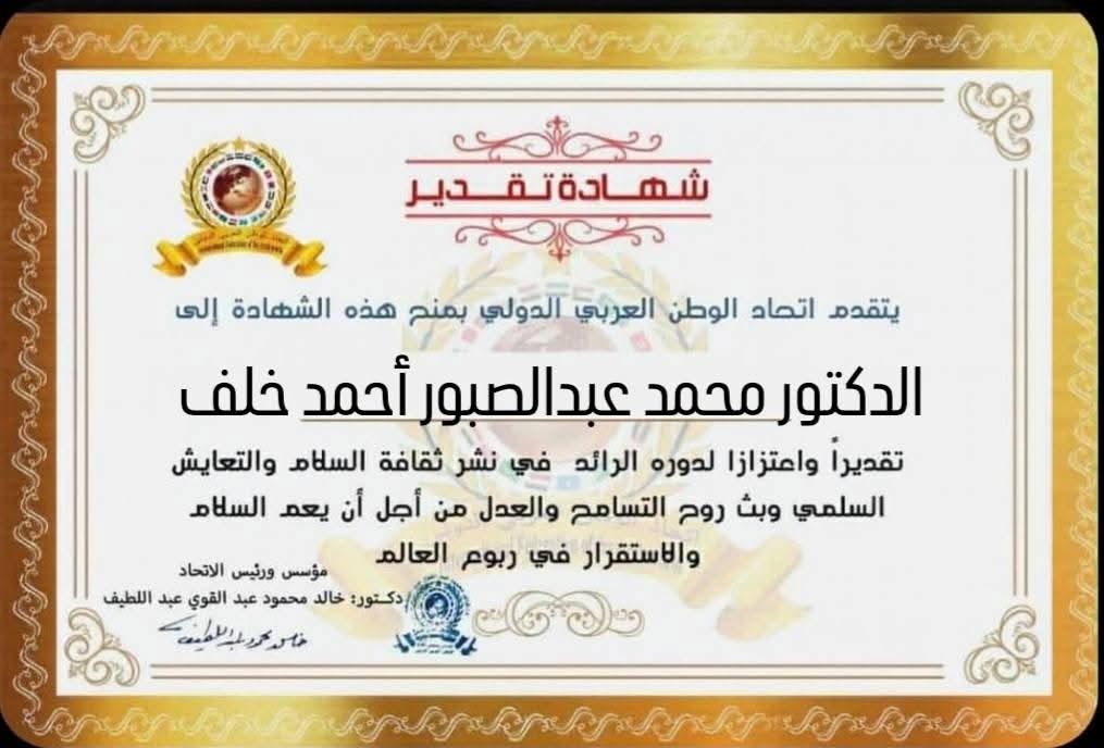 مؤسس ورئيس اتحاد الوطن العربي الدولي يمنح شهادة تقدير للدكتور محمد عبد الصبور أحمد خلف عميد كلية الطب جامعة قنا بجمهورية مصر العربيةitihadworld14/04/2026تكريمات
