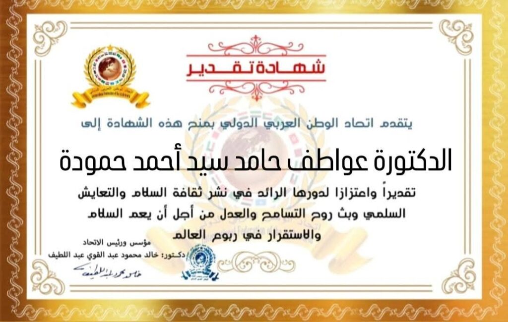 مؤسس ورئيس اتحاد الوطن العربي الدولي يمنح شهادة تقدير للدكتورة عواطف حامد سيد أحمد حمودة عميد كلية تكنولوجيا المصايد والأسماك جامعة أسوان بجمهورية مصر العربيةitihadworld14/04/2026تكريمات