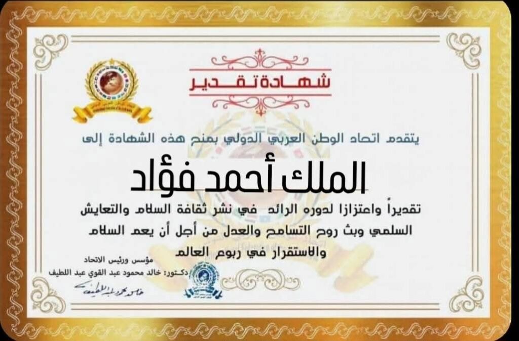 مؤسس ورئيس اتحاد الوطن العربي الدولي يمنح شهادة تقدير للملك أحمد فؤاد ملك مصر والسودان السابق