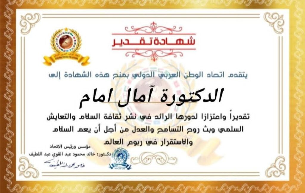 مؤسس ورئيس اتحاد الوطن العربي الدولي الدكتور خالد محمود عبد القوي عبد اللطيف يمنح شهادة تقدير للمديرة التنفيذية للهلال الأحمر المصري