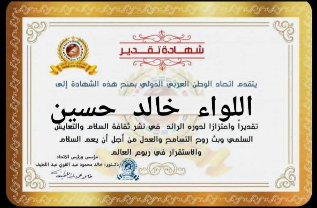 مؤسس ورئيس اتحاد الوطن العربي الدولي يمنح شهادة تقدير للواء خالد حسين نائب رئيس جهاز المخابرات العامة المصريةitihadworld03/01/2026تكريمات