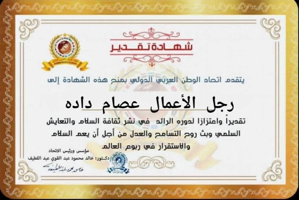 مؤسس ورئيس اتحاد الوطن العربي الدولي يمنح شهادة تقدير لرجل الأعمال عصام دادهitihadworld04/01/2026تكريمات