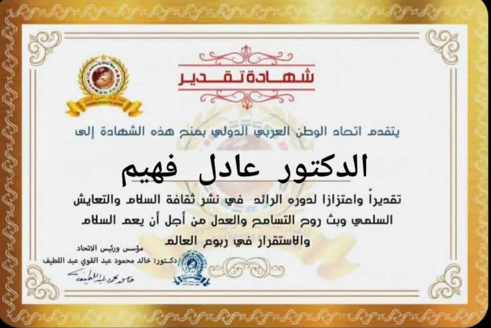 مؤسس ورئيس اتحاد الوطن العربي الدولي يمنح شهادة تقدير للدكتور عادل فهيم رئيس الإتحاد العربي لكمال الأجسامitihadworld04/01/2026تكريمات