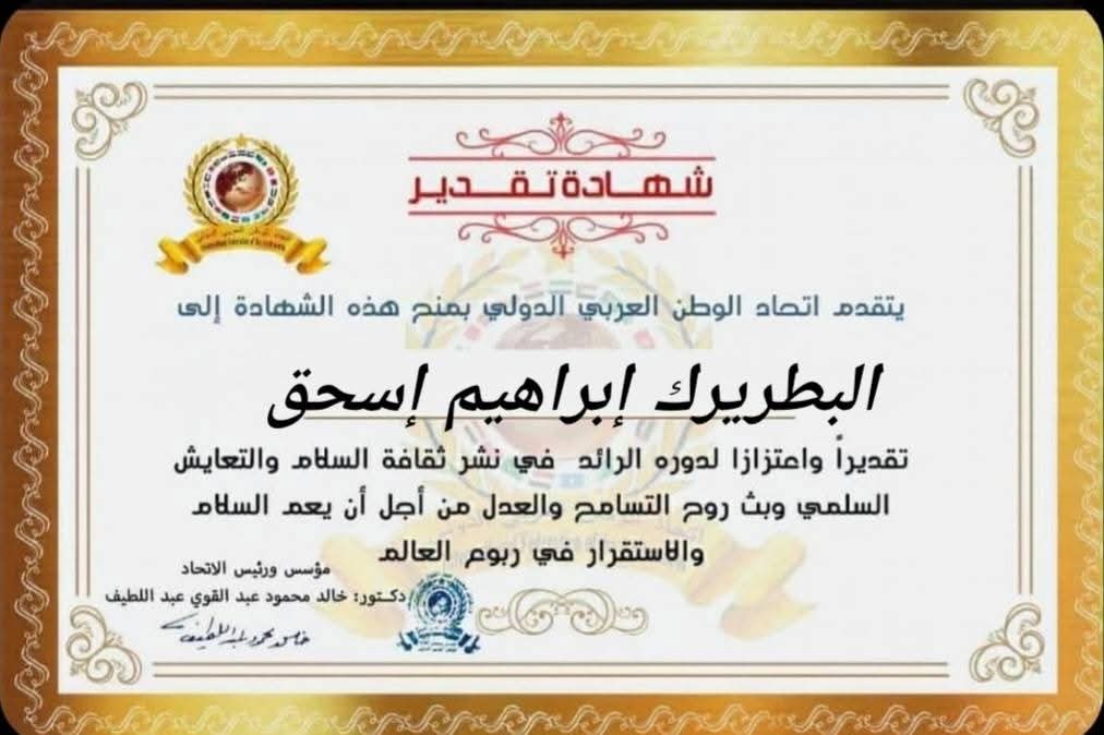 مؤسس ورئيس اتحاد الوطن العربي الدولي يمنح شهادة تقدير للبطريرك إبراهيم إسحق بطريرك الاقباط الكاثوليكitihadworld06/01/2026تكريمات