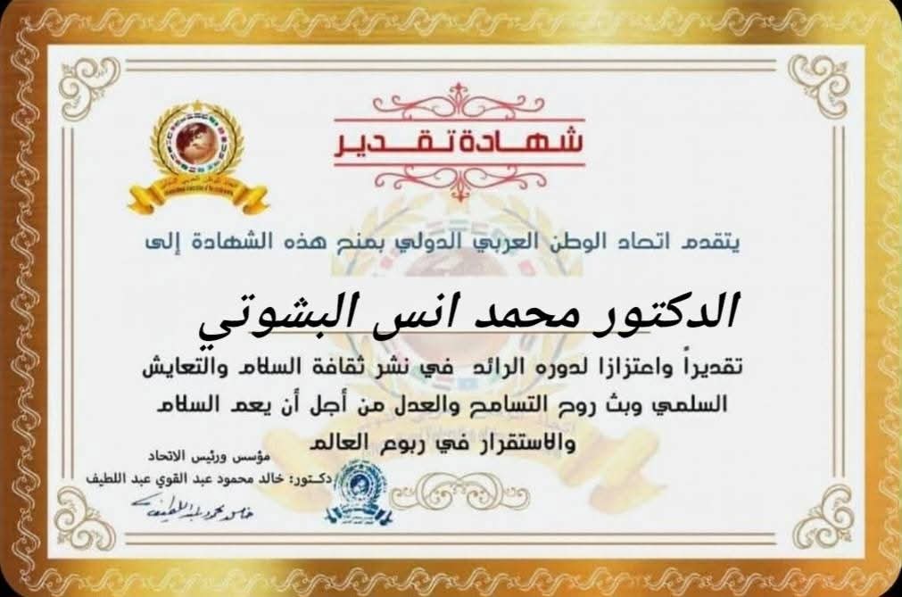 مؤسس ورئيس اتحاد الوطن العربي الدولي يمنح شهادة تقدير للدكتور محمد انس البشوتي نائب رئيس مجلس إدارة المقاولين العرب عثمان أحمد عثمان وشركاه