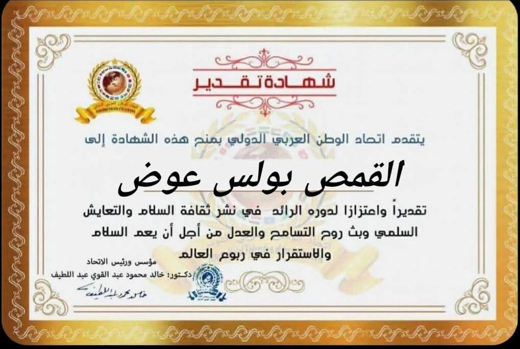 مؤسس ورئيس اتحاد الوطن العربي الدولي يمنح شهادة تقدير للقمص بولس عوض امين مساعدات بيت العائلة المصريةitihadworld06/01/2026تكريمات