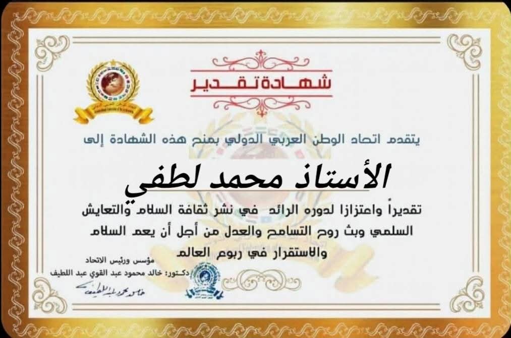 مؤسس ورئيس اتحاد الوطن العربي الدولي يمنح شهادة تقدير للأستاذ محمد لطفي مدير إدارة الخدمات والبحوث الإجتماعية بشركة المقاولين العربitihadworld06/01/2026تكريمات