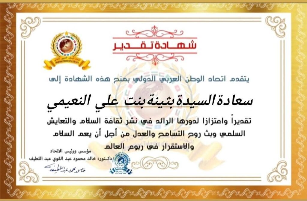مؤسس ورئيس اتحاد الوطن العربي الدولي يمنح شهادة تقدير لسعادة السيدة بثينة بنت علي الجبر النعيمي وزيرة التنمية الإجتماعية والأسرة القطريةitihadworld06/01/2026تكريمات