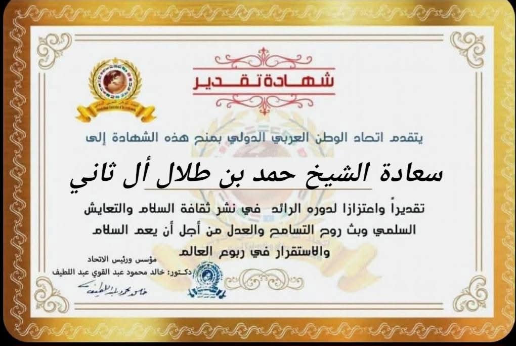 مؤسس ورئيس اتحاد الوطن العربي الدولي يمنح شهادة تقدير لسعادة الشيخ حمد بن طلال أل ثاني الرئيس التنفيذي لشركة الديار القطريةitihadworld06/01/2026تكريمات