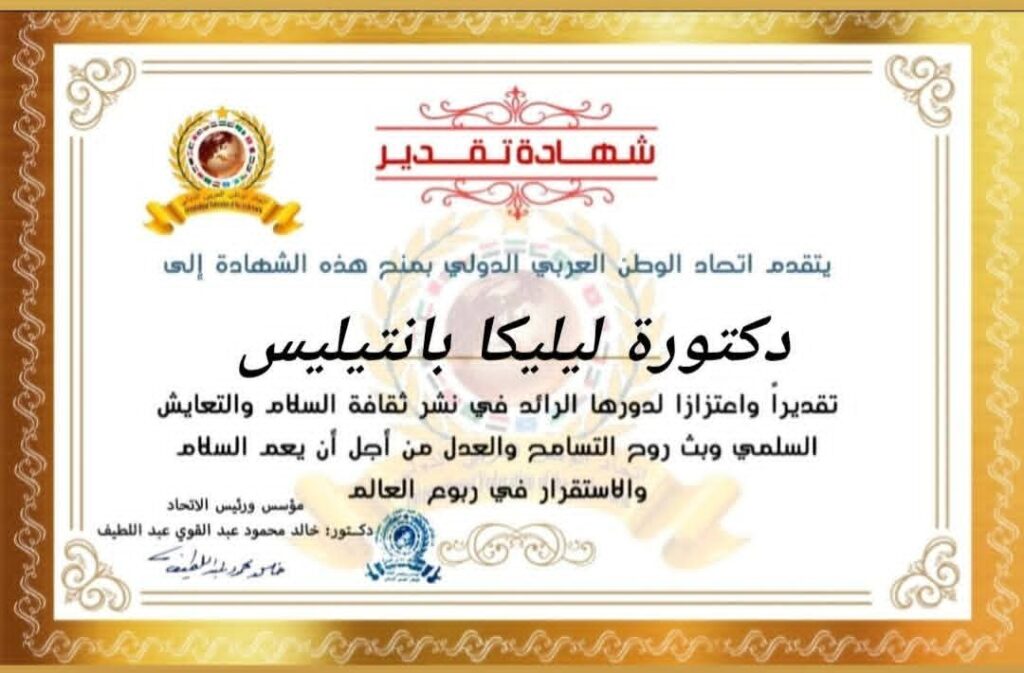 مؤسس ورئيس اتحاد الوطن العربي الدولي يمنح شهادة تقدير للدكتورة ليليكا بانتيليس رئيس النادي اليوناني البحري بالإسكندريةitihadworld08/01/2026تكريمات