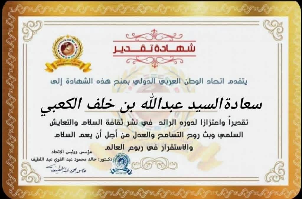 مؤسس ورئيس اتحاد الوطن العربي الدولي يمنح شهادة تقدير لسعادة السيد عبدالله بن خلف بن حطاب الكعبي وكيل وزارة الداخلية