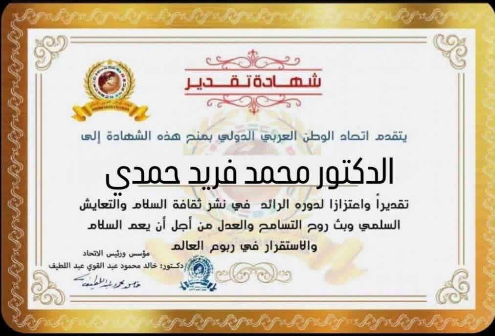 مؤسس ورئيس اتحاد الوطن العربي الدولي يمنح شهادة تقدير للدكتور محمد فريد حمدي آمين النقابة العامة للأطباء