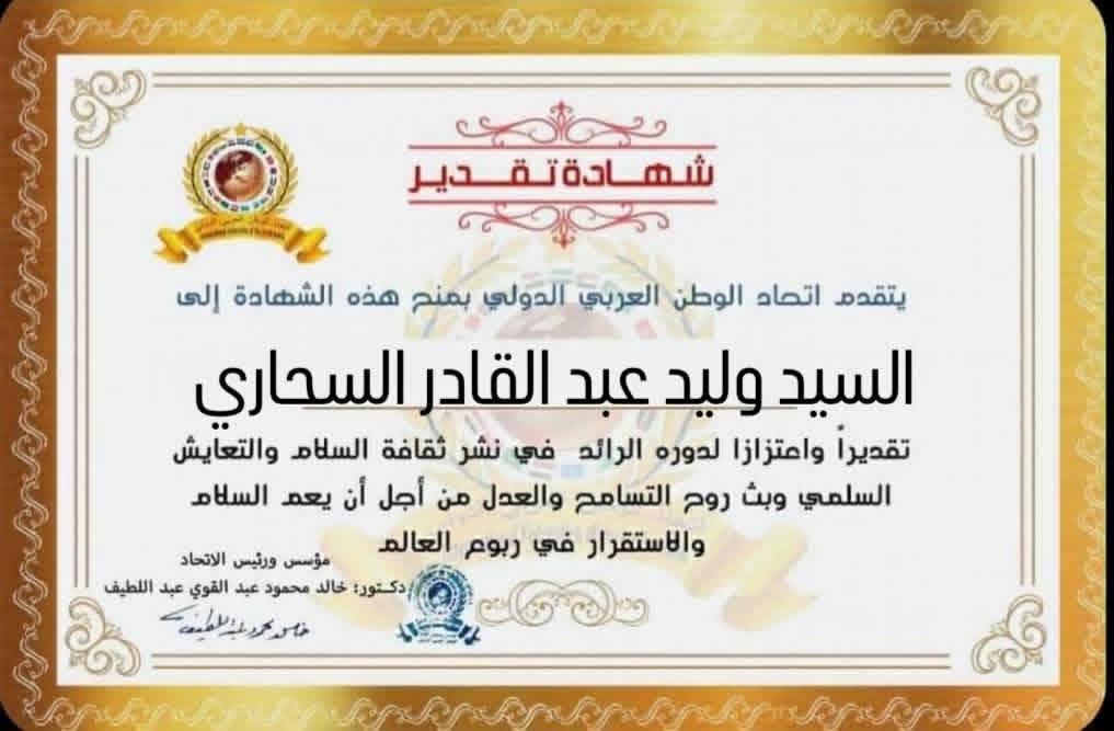 مؤسس ورئيس اتحاد الوطن العربي الدولي يمنح شهادة تقدير للسيد وليد عبد القادر السحاري رئيس مجلس الأعمال السوري الألمانيitihadworld08/01/2026تكريمات