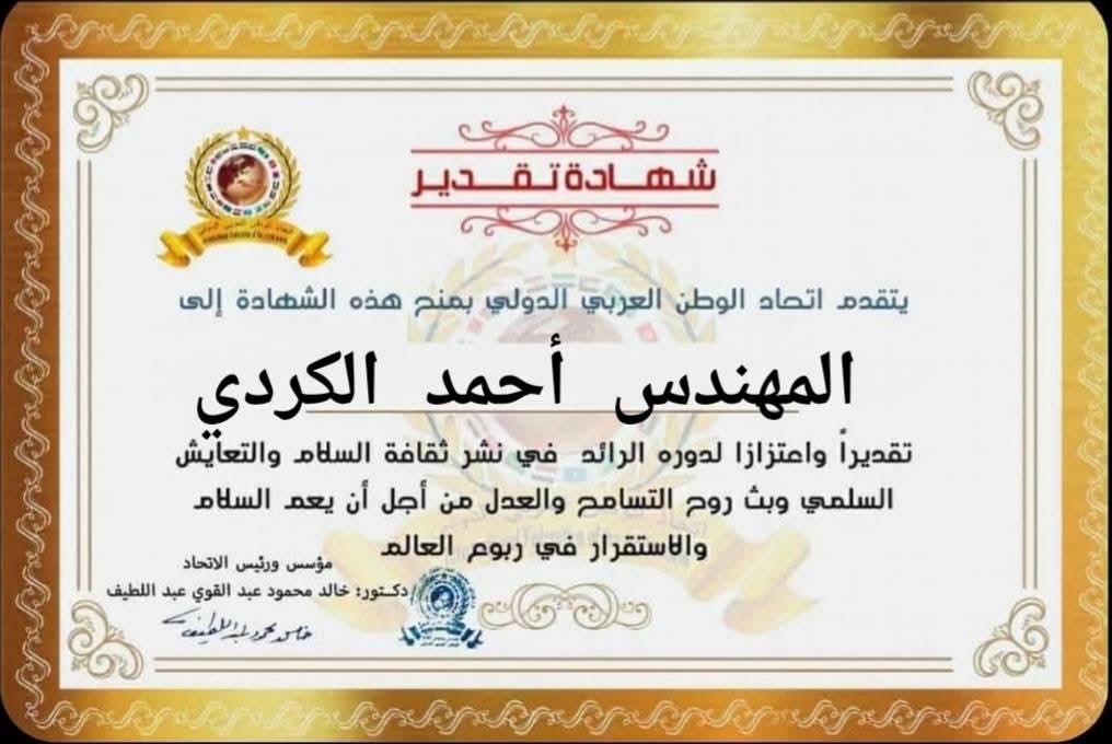 مؤسس ورئيس اتحاد الوطن العربي الدولي الدكتور خالد محمود عبد القوي عبد اللطيف يمنح شهادة تقدير للسيد المهندس مدير المدينة الصناعية بحلب