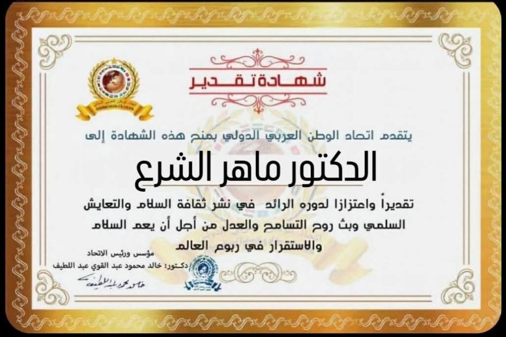 مؤسس ورئيس اتحاد الوطن العربي الدولي يمنح شهادة تقدير للدكتور ماهر الشرع الأمين العام لرئاسة الجمهورية العربية السورية