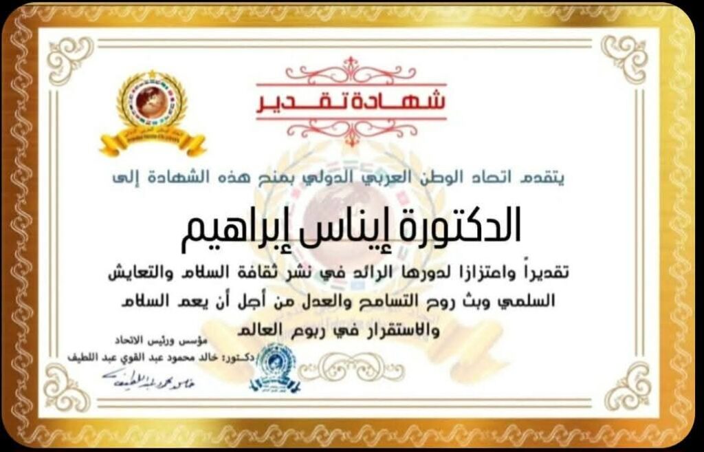 مؤسس ورئيس اتحاد الوطن العربي الدولي يمنح شهادة تقدير للدكتورة إيناس إبراهيم نائب رئيس جامعة دمنهور بجمهورية مصر العربيةitihadworld08/01/2026تكريمات