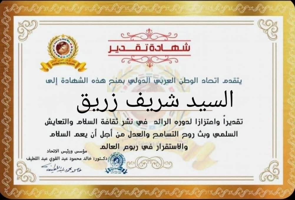 مؤسس ورئيس اتحاد الوطن العربي الدولي يمنح شهادة تقدير للسيد شريف زريق أمين صندوق كنيسة القديس جيورجيوسitihadworld08/01/2026تكريمات