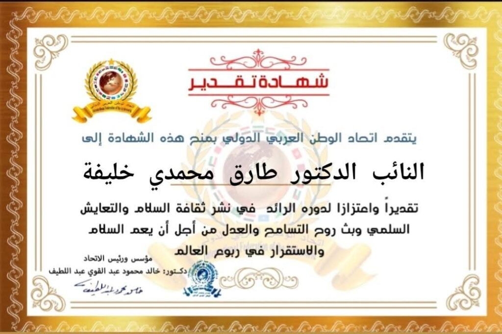 مؤسس ورئيس اتحاد الوطن العربي الدولي الدكتور خالد محمود عبد القوي عبد اللطيف يمنح شهادة تقديرللنائب الدكتور. عضو مجلس النواب عن دائرة مركز طنطا بمحافظة الغربية من جمهورية مصر العربيةitihadworld20/12/2025تكريمات