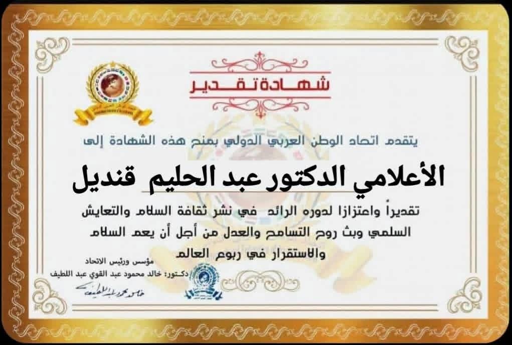 مؤسس ورئيس اتحاد الوطن العربي الدولي يمنح شهادة تقدير للإعلامي الدكتور عبد الحليم قنديل